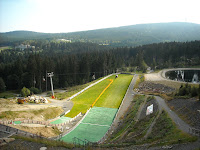 Vanaf de camping ging de route verder door het Fichtelgebergte. We hebben over de eerste paar kilometers bijna 2 uur gedaan. Nee we hadden geen pech, er was geen omleiding of waren we verkeerd gefietst, maar de omgeving was hier zo ontzettend mooi dat we gewoon niet weg wilden uit dit gebied. Het is een klein wintersport gebied waar de uitzichten adembenemend zijn. Met de stoeltjeslift werden de vakantiegangers daar verder omhoog gebracht. Een skischans waar we onderdoor fietsen, man wat is zo'n ding hoog. Je moet er niet aan denken dat je daar vanaf moet op je latten. Maar aan alles komt een einde, zo ook aan dit gebied en we moesten nu wel verder want we hadden vandaag een lange route van 90 km voor de boeg en we waren al een uur te laat vertrokken.