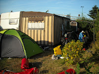 Na 10 minuten komt de enige aardige werknemer van de camping aangefietst en neemt ons eindelijk mee naar het enige plaatsje dat nog vrij is op deze reusachtige camping. Deze camping heeft alleen maar vaste staanplaatsen voor caravans en geen trekkerstent veldje vertelt de man ons. Raar dat ze dat aan de receptie niet weten. We hebben in deze vakantie heel wat campings gezien van luxe tot in de achtertuin bij een familie, maar deze plek was wel heel bijzonder. Bij een afbraak caravan konden we op het kleine stukje gras onze tent voor 8 euro opzetten. Verbaasd kijken we elkaar aan en na er zeker van te zijn dat deze bewoner echt niet meer komt opdagen vandaag zetten we dan maar onze tent op. De opzichter komt ons later wel nog twee munten voor de doucheruimte brengen en hoeven deze ook niet te betalen.