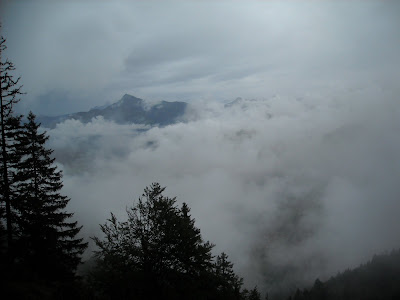 Eenmaal op de top hebben we een uitzicht van 5 meter en heel even trekt de lucht open en kijken we een in een afgrond waar je duizelig van wordt. We schrijven onze handtekeningen in het berglogboek dat mooi in een kluisje ligt dat is vastgemaakt aan het houten kruis. Na de broodjes te hebben gegeten beginnen we aan de gevreesde afdaling via dezelfde weg die we met moeite naar boven zijn geklommen.