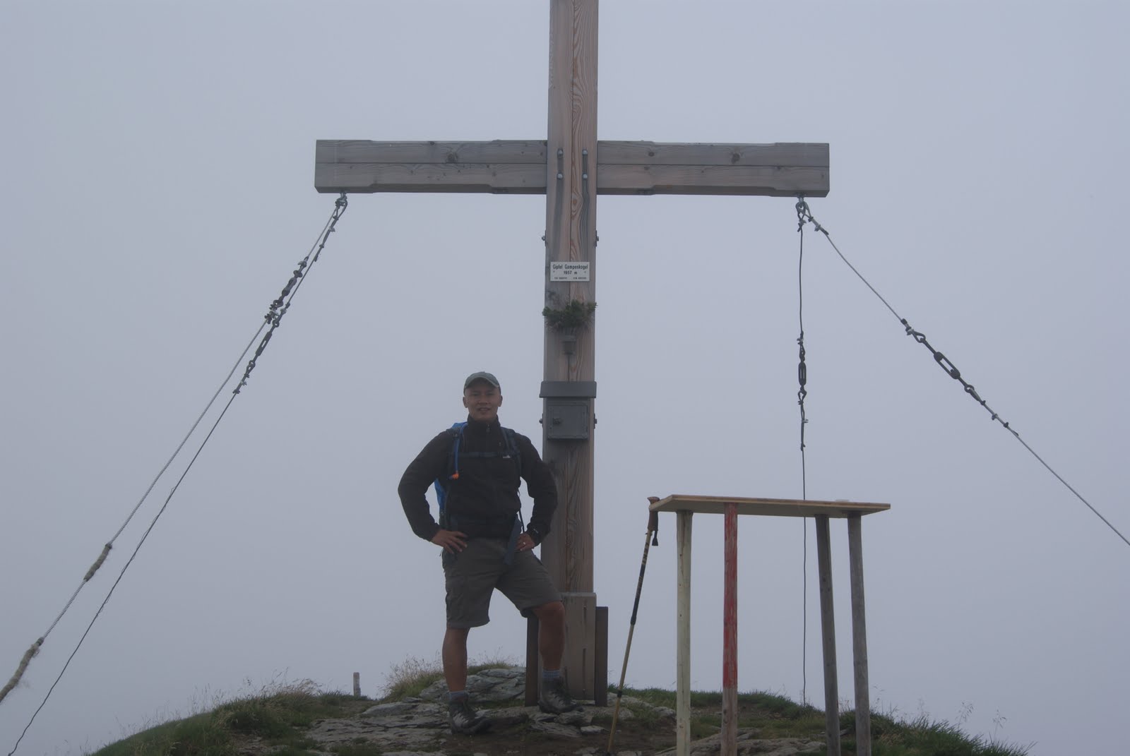 En dan de laatste 200 meter naar de top. Er moet geklommen worden op een kam die op sommige plaatsen niet breder is dan 3 meter met aan de rechterkant een afgrond van enkele honderden meters. Een hoop gevloek van mij en bijna heb ik de handdoek in de ring gegooid en was ik omgedraaid. Doodeng vinden we het alle twee vooral ook omdat het zo mistig is en de top nog niet te zien was. Maar na een paar angstige minuten komt het grote houten kruis dat zich op de top bevind dan toch in zicht en klimmen we alle twee moedig verder.