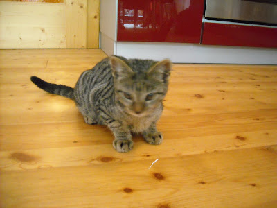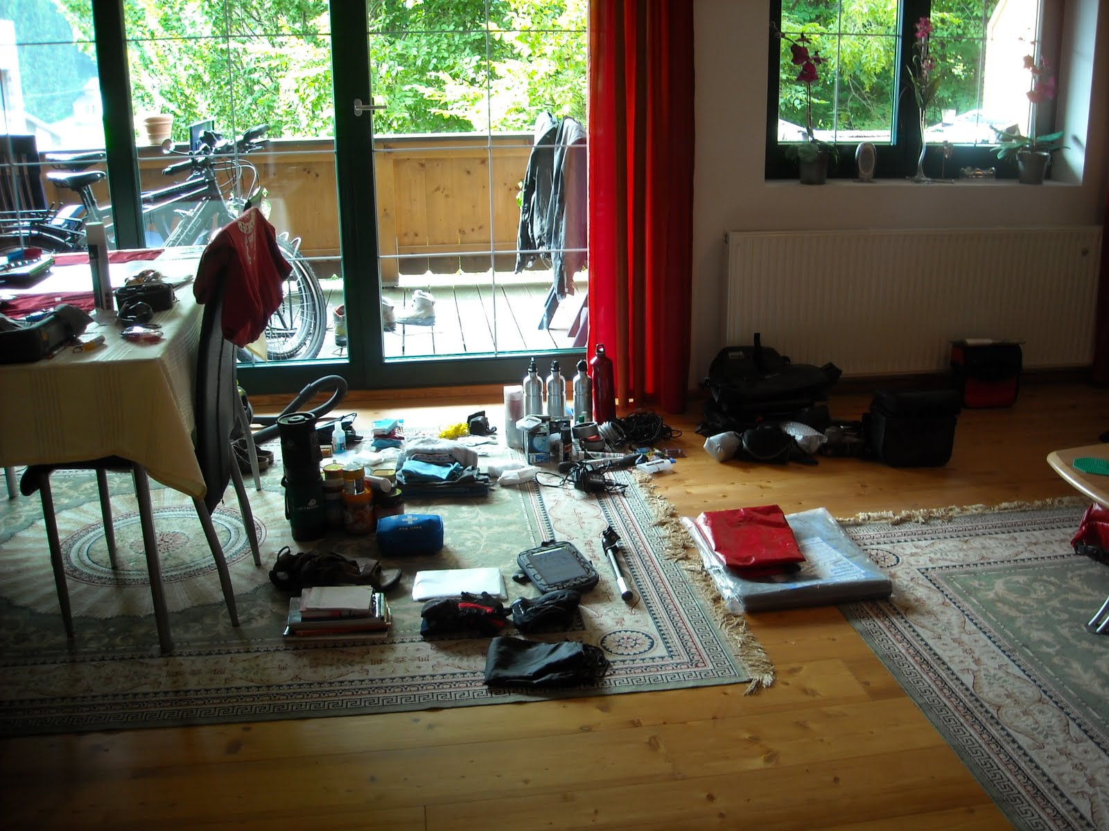 Met fietsvakanties is het noodzakelijk alleen spullen mee te nemen die perse nodig zijn. Iedere gram telt mee als de vermoeidheid toeslaat of als er bergop gefietst moet worden. Dus op dit moment kwalificeren we al onze meegebrachte spullen op hun noodzakelijkheid. Daarbij gadegeslagen door het jonge poesje van de buren die bij ons via het balkon is binnengelopen.