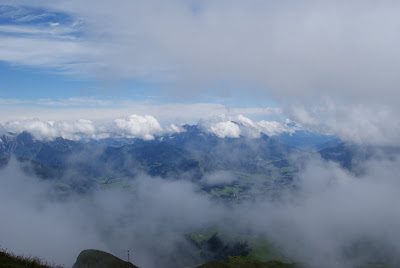 Boven aangekomen is er van een weidse uitzicht geen sprake. Een dichte mist maakt het onmogelijk om 10 meter voor je te zien laat staan het Karwendel gebergte. Soms duikt een bergpanorama op vanachter een dichte wegdrijvende mistwolk om binnen luttele seconden weer te verdwijnen achter een nieuwe mistbank.