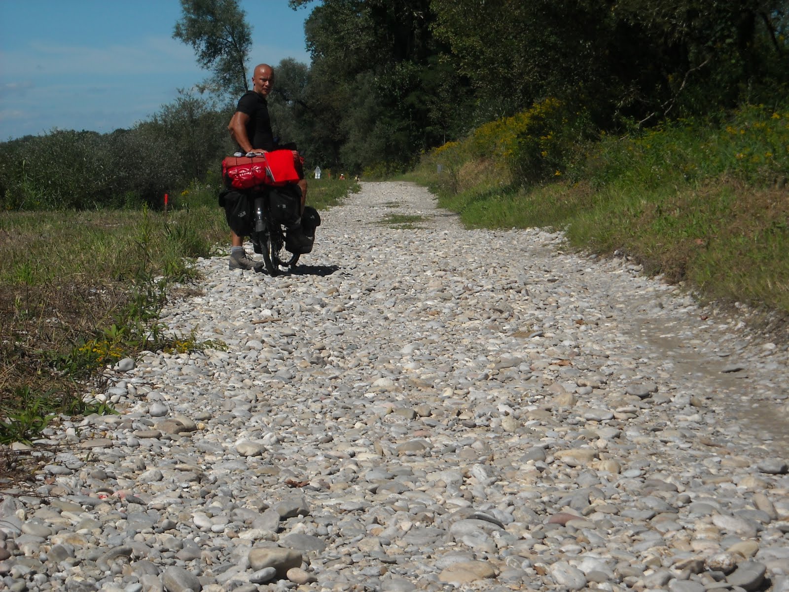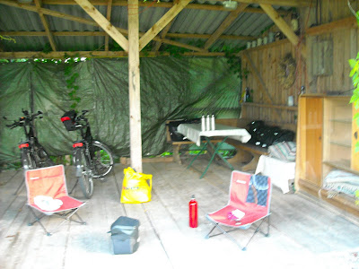 Hier heb je echt goede banden op de fiets nodig, dat was niets voor onze fietsen dan hadden wij ze toch wel lek gereden.Hadden jullie de tent maar onder het afdak gezet.