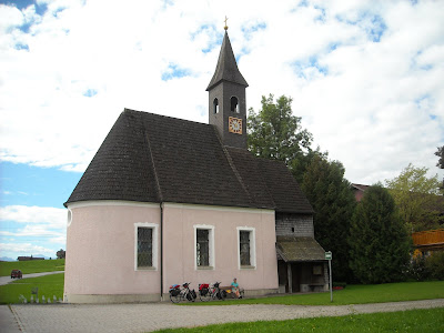 In Ach aangekomen vinden we geen VVV-kantoor en rijden daardoor over de brug naar de Duitse buren het stadje Burghausen. Zij verwijzen ons weer retour met een adresje naar het Oostenrijkse Ach. Na lang zoeken komen we op een boerderijtje aan en de eigenaresse komt ons al tegemoet gelopen. Aangezien er verder niemand staat hebben we keus te over. Er is echter een ding mis met het mooi gemaaide grasveldje, het loopt bijna overal scheef behalve op het lage gedeelte van de heuvel.