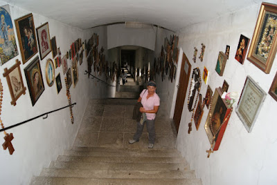 Het blijkt dat deze trap veel bezocht wordt door pelgrims van Midden- en Zuid-Europa. Het is de bedevaartsgang om hulp te vragen aan de Heilige Maria. Terwijl wij er zijn besteigen pelgrims al biddend de trap. Op iedere trede van de 321 stuks wordt een gebed gepreveld en op iedere tussenportaal wordt al knielend een gebed opgezegd voor een Christus beeld. Het is vreemd maar indrukwekkend om te zien. Aan de wanden hangen creaties van pelgrims zoals foto’s, schilderijen, tekeningen, beeldjes en zomeer van diegenen die Maria bedanken voor haar hulp of hun angst en verdriet leggen in hetgeen hier aan de wand hangt. Intrigerend zijn de echte foto’s van mensen, naamloos voor ons, die hier aan de wanden hangen omdat ze om de een of andere manier in de problemen zitten, ziek zijn of familieleden hebben die ziek zijn. We zien smeekbedes aan de muur hangen van grootouders voor kleinkinderen, van echtgenoten voor partners, van iedereen die iemand of anderen liefhebben waar het niet goed mee gaat.
