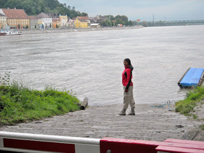 In Enns, het oudste stadje van Oostenrijk, moeten we het veerpont nemen naar Mauthausen. Daar aangekomen zien we echter geen veerpont en ook aan de overkant is niks te bekennen. Volgens de vaartijden zijn we niet te vroeg nog te laat. "Ik hoop niet dat we staan te wachten op de oudst levende veerman in het oudste stadje van Oostenrijk want dan staan we nog wel even" probeer ik grappig te zijn. Een ander Duits ouder fietsechtpaar arriveert ook ter plekke en zien meteen een telefoonnummer staan ergens op een verborgen paaltje. De man belt en inderdaad het is de veerman en hij is onderweg. Terwijl we staan te wachten kletsen we gezellig over leuke fietsvakanties en voor we het weten komt het bootje dat ons naar de overkant brengt aantuffen.