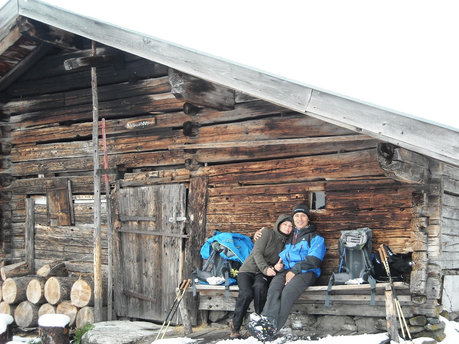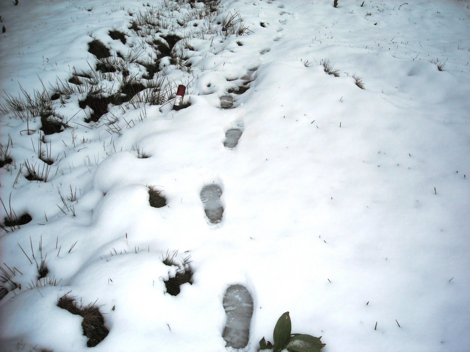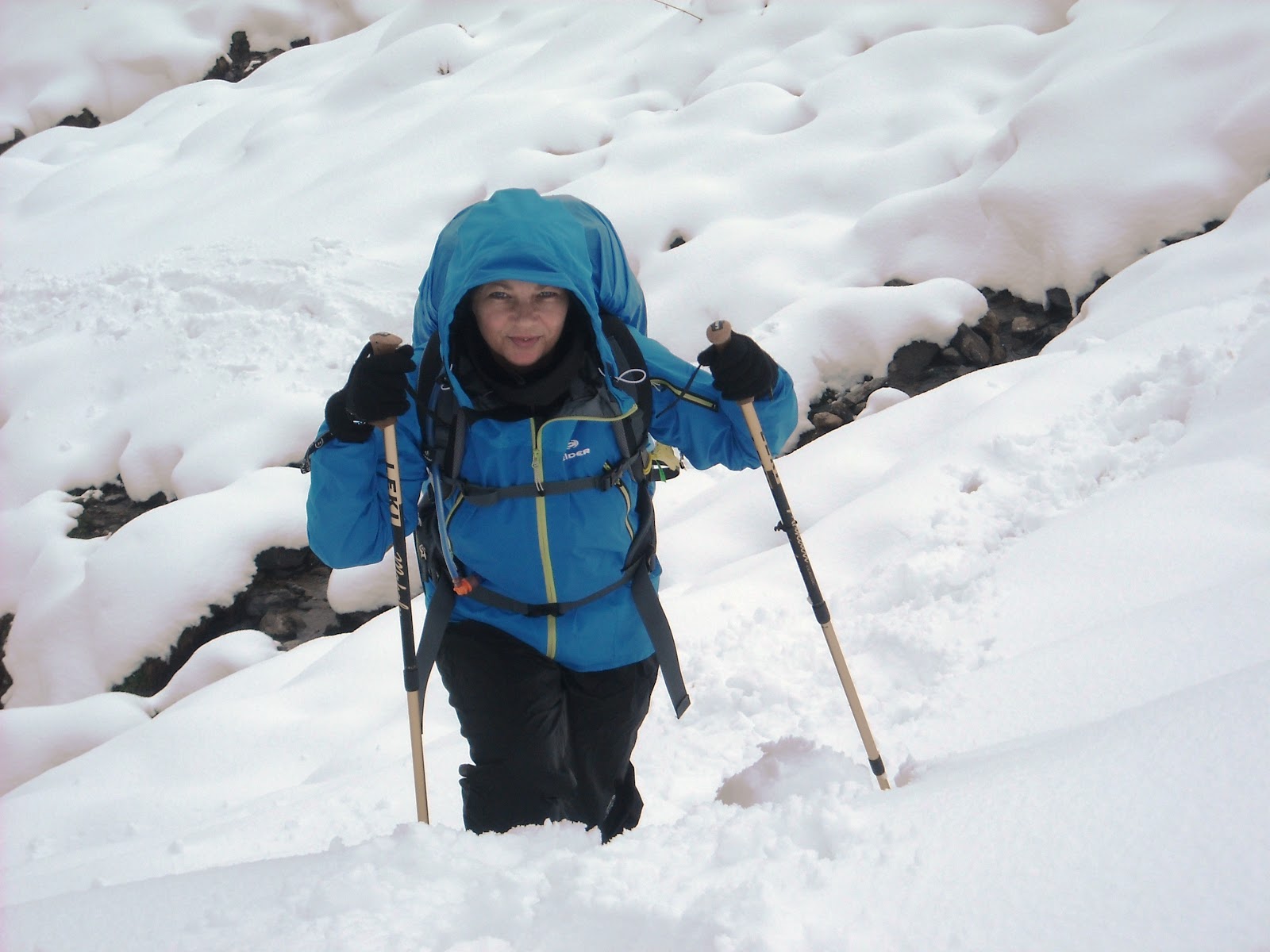 Nergens passeren we een plateau waar je benen even rust wordt gegund. Steil vervolgen we het pad omhoog. Op de 1300 meter grens is het een winters landschap. We worden overvallen door vrolijkheid zoals kinderen die bij het wakker worden zien dat het 's nachts gesneeuwd heeft. Wel zijn we zoekende naar het symbool her en der geschilderd op rotsklompen die de route aangeeft. Door de sneeuw kunnen we deze niet meer vinden. Wel zien we voetstappen van 1 persoon in de sneeuw en we besluiten deze te volgen.